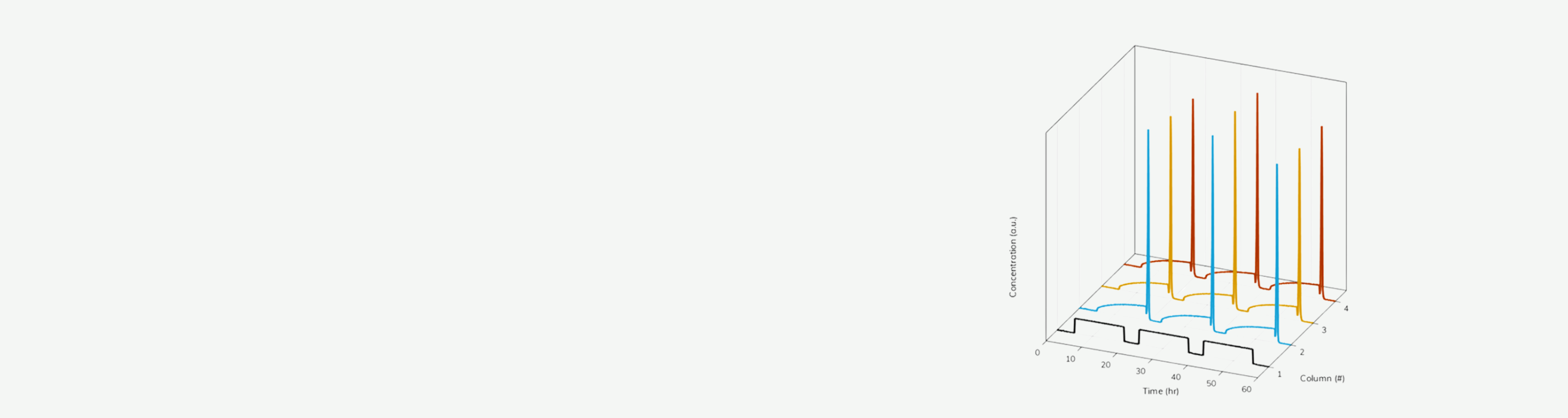 Figure 1 shows the effluent concentration of three adsorption columns tested in parallel, together with an empty column across three adsorption and three desorption cycles. Momentarily, Avantium studies these types of applications using 8 columns, however scaling to 16 or even 32 is possible. The great advantage of this new equipment is that breakthrough curves are measured on-line and no need to wait for the analysis. Because all equipment is completely automated, it is easy to change process parameters automatically. In this way a unit may operate 24/7 to measure adsorption/desorption cycles during different process conditions.